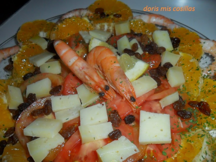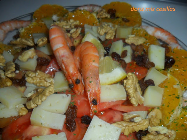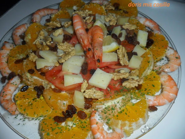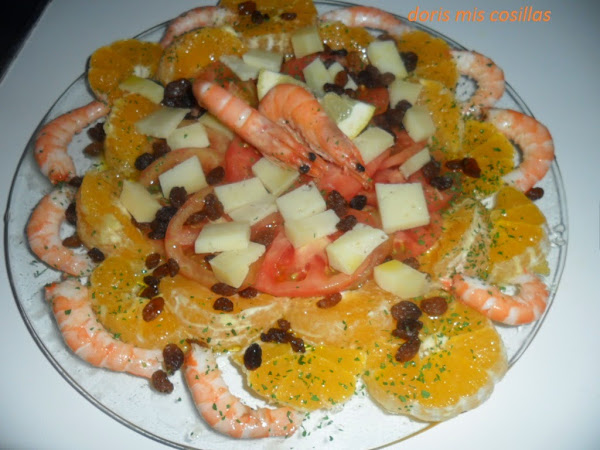En una fuente, poner en el centro, los tomates pelados a rodajas, las naranjas sin la parte blanca.Pelar los langostinos y acomodamos alrededor de la fuente, dejamos algunos sin pelar para la decoración.