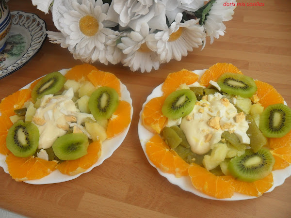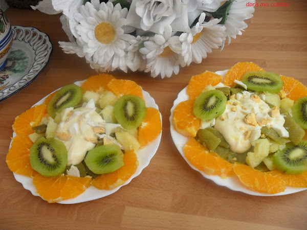 Pelamos los kiwi y cortamos en rodajas.Terminamos salando ligeramente y agregamos la mayonesa cantidad al gusto.( Yo le puse mayonesa casera o si preferimos industrial.