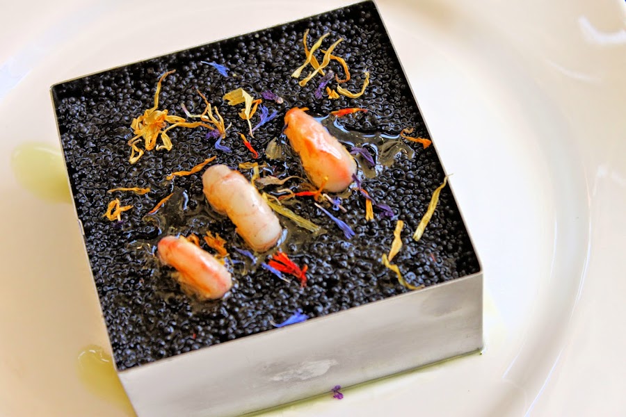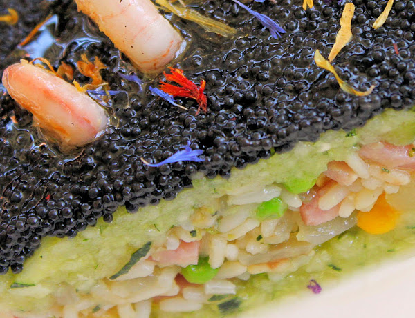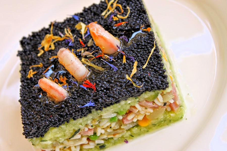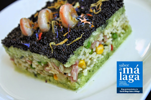 Ponemos un molde cuadrado o redondo en un plato llano y lo vamos llenando a capas en el siguiente orden: 1ª capa de vinagreta de pepino, 2ª capa de arroz cinco delicias, 3ª capa de la vinagreta, 4ª capa con la mitad de las huevas negras y decoramos con las gambas y flores comestibles.