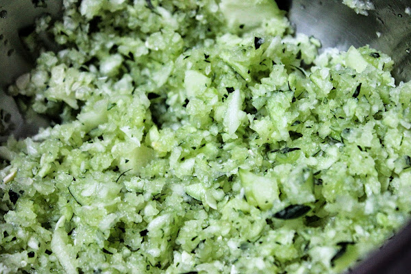 Hacemos la vinagreta con el aove, vinagre y sal, remover enérgicamente. Pelar a medias el pepino (no quitar en su totalidad la piel) y picarlo muy chiquito, mezclarlo con la vinagreta.