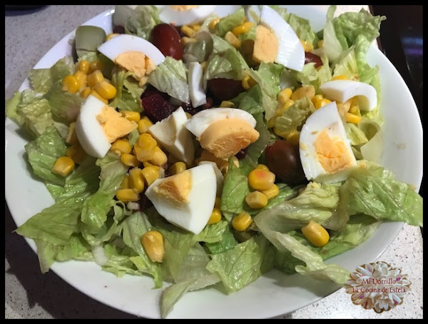 La receta de Dulcinea:(Mix de lechugas, aceitunas, mix de tomates cherry (de tres colores),zanahoria, huevo duro, anchoas, atún, cebollitas encurtidas, maíz, y alcachofas.)