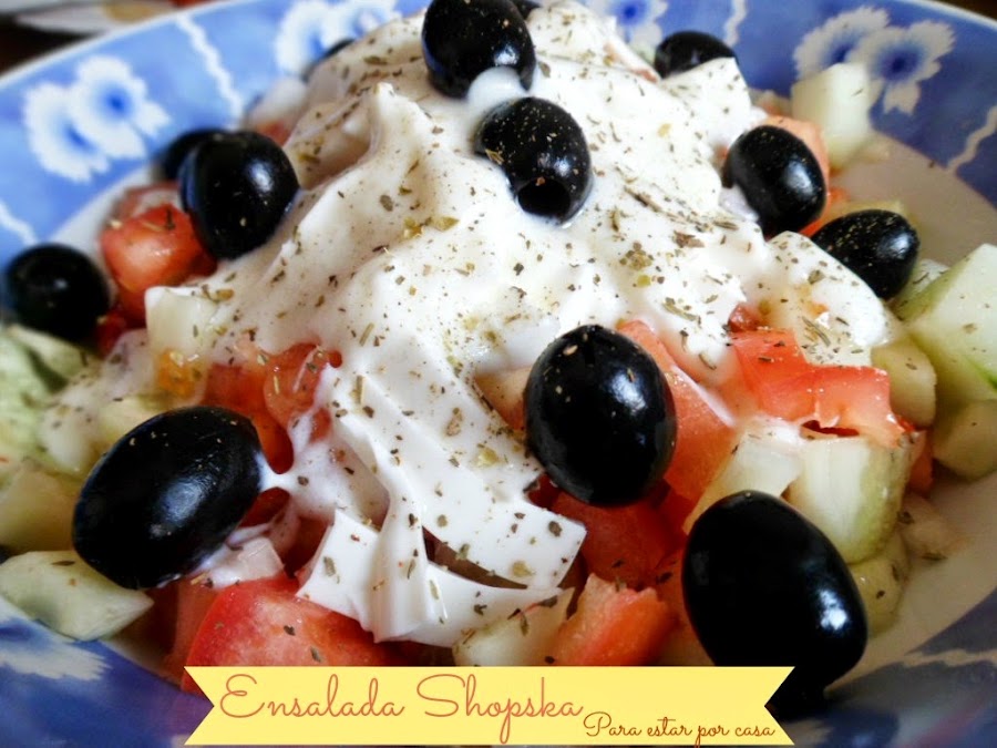 La ensalada shopska es una ensalada elaborada con tomates, pepino, cebolla, pimiento (fresco o asado) y queso feta. Todo aliñado con aceite de oliva y vinagre. Se suele servir como entrante o primer plato, acompañado siempre de bebidas típicas de la zona que son elaboradas artesanalmente.