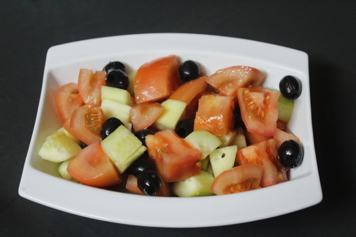 Colocamos el tomate, el pepino y las aceitunas en una fuente.