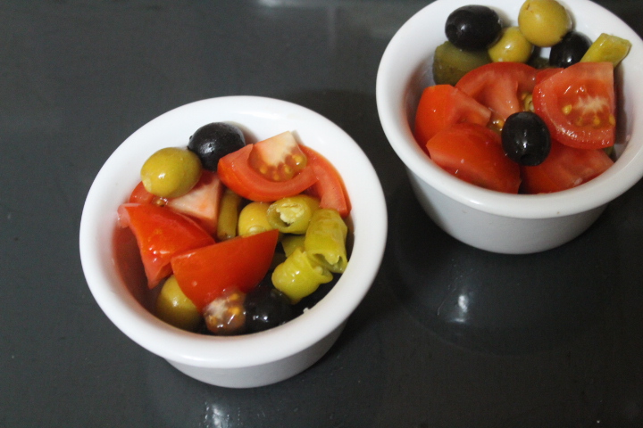 Troceamos ambas guindillas en vinagre, uniéndolas al tomate y las rodajas de pepinillo.