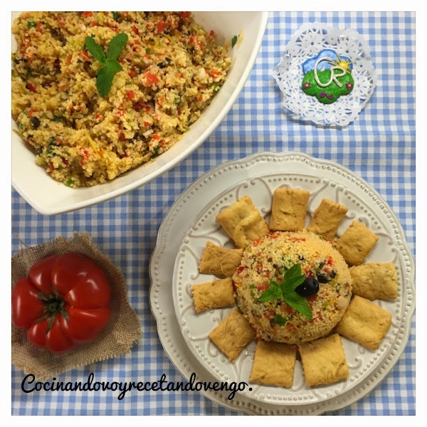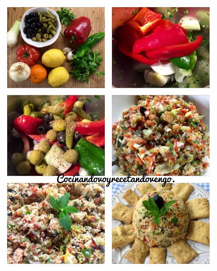 El cous cous es muy muy fácil de hacer y en 3 minutos está listo, así que no hay excusas, luego hacer a modo de un salpicón como más nos guste pero bien picadito: con cebolla, pimientos, tomate, aceitunas y para esta receta conocida como tabulé un toque de comino molido y limón. Seguro que os encantará!! si no la conocéis, os recomiendo que la preparéis, se convertirá en un clásico.