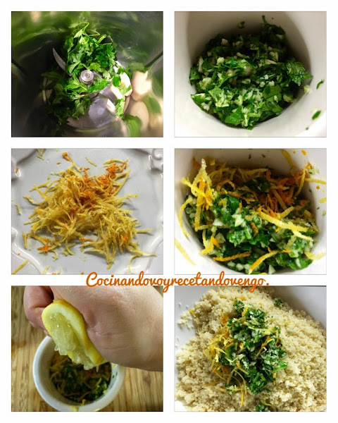 Lavar el limón y la naranja. Rallar la piel y reservar junto a la picada de ajos y perejil. Exprimir el zumo de limón y naranja y mezclar todo con el cous cous, para que valla cogiendo sabor.