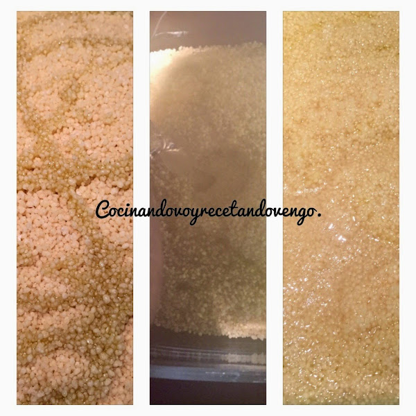 Pesamos el cous cous y lo reservamos en un bol grande. Ponemos un hilo de aceite por encima o una cucharada. Hervimos o calentamos agua (yo uso un hervidor, pero se puede calentar en un cazo) Volcar el agua caliente sobre el cous cous, mover con una cuchara para que se mezcle bien y dejar reposar. En unos 3 minutos tendremos el cous cous listo. Luego lo movemos con una cucharilla o tenedor, para que quede sueltecito y reservamos.