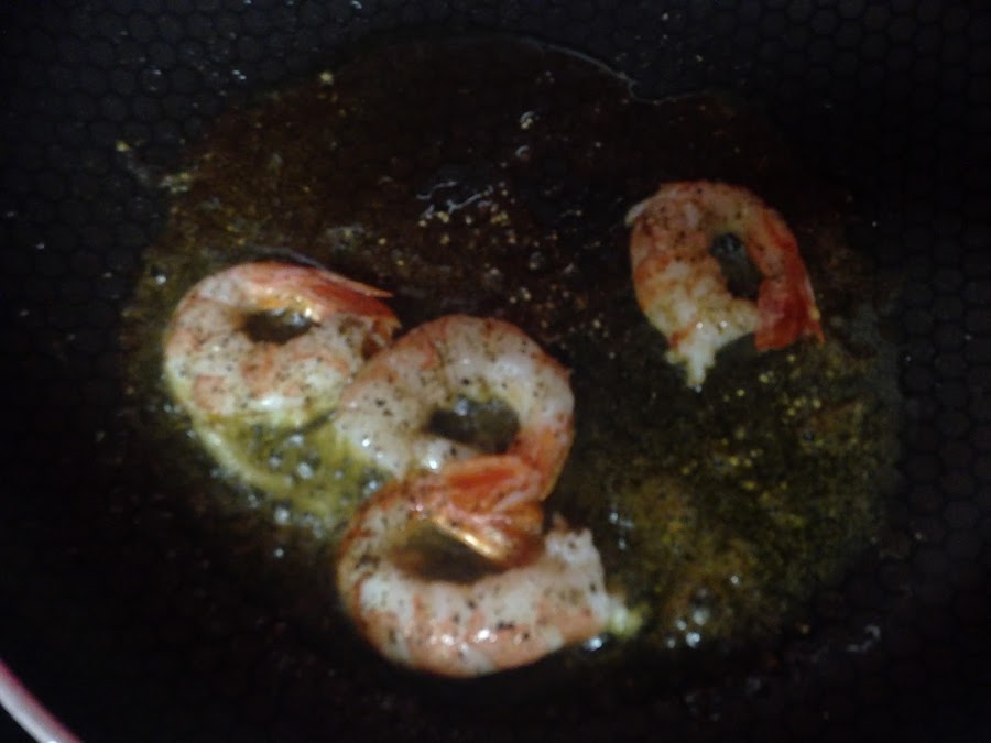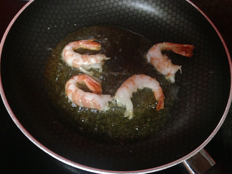 Pelaremos las gambas y la salteraremos en una paella con un poco de aceite.