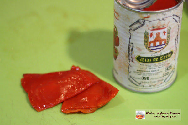 Para montar el plato ponemos una capa de patatas confitadas y la cubrimos con los pimientos de piquillo cortados en tiras.