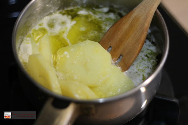 En ese mismo aceite, que tiene ya muchos aromas dentro, confitaremos las patatas. Para acelerar el proceso las cortamos en rodajitas de un par de milímetros y las dejamos al mínimo durante unos 20 minutos hasta que estén tiernas.