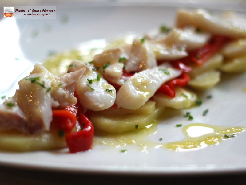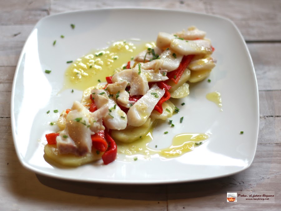 Sobre la capa de patatas y pimientos ponemos las lascas de bacalao y completamos con un poco de cebollino picado y un par de cucharadas del aceite que hemos estado usando, repartidas por encima y manchando el plato, porque tiene todos los sabores concentrados. La ensalada templada de bacalao con pimientos del piquillo y patatas confitadas queda espectacular. Ya veréis como os gusta a todos, en especial cuando el buen tiempo nos anima a tomar platos como éste.
