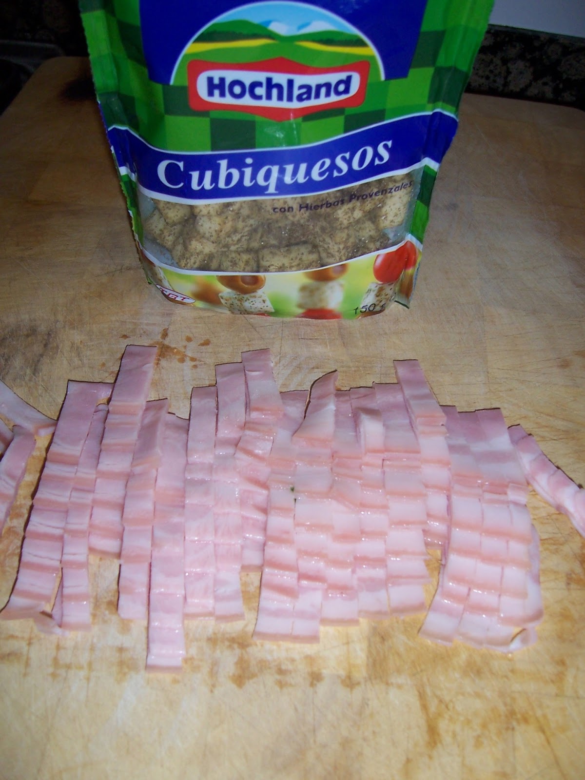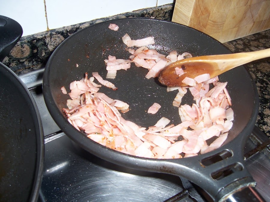 cortamos el bacón en tiras y lo salteamos en una sartén sin aceite.