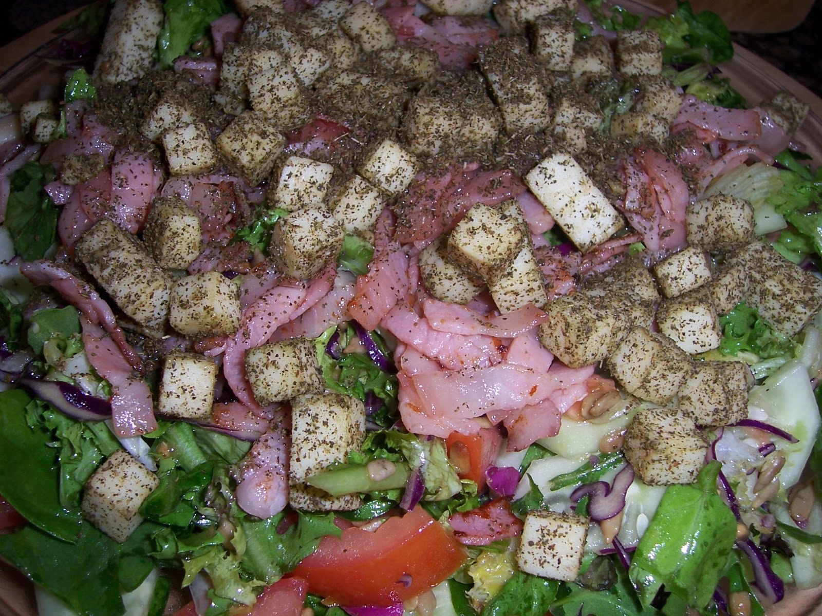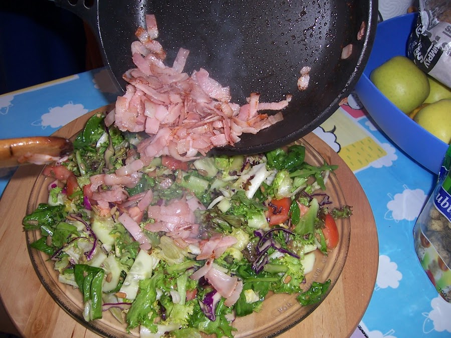 Ponemos la ensalada en una fuente para servir y le añadimos el bacón caliente y los cubiquesos.
