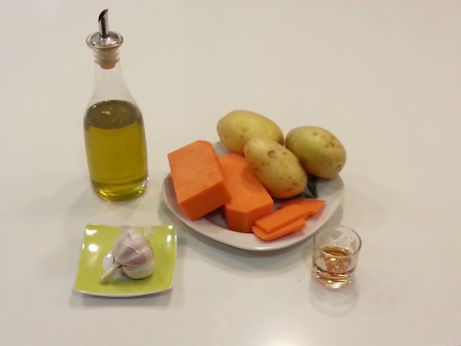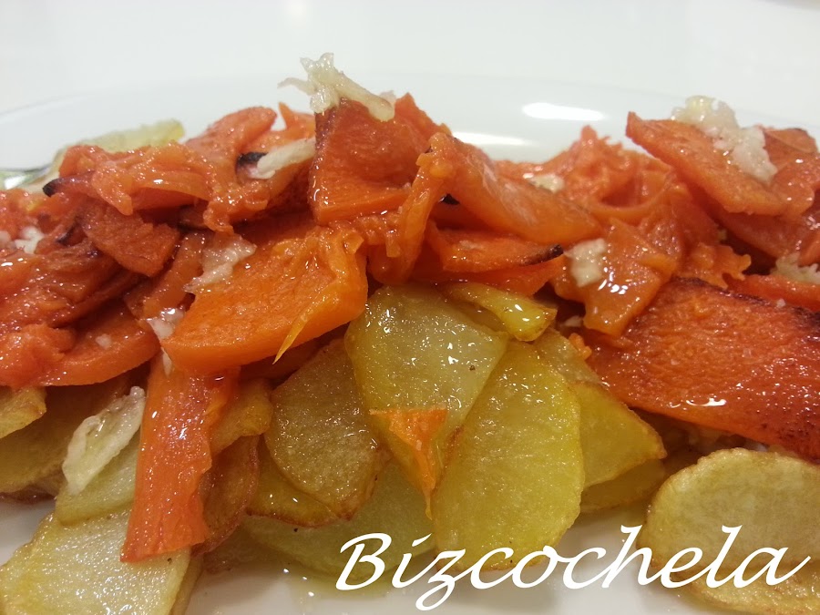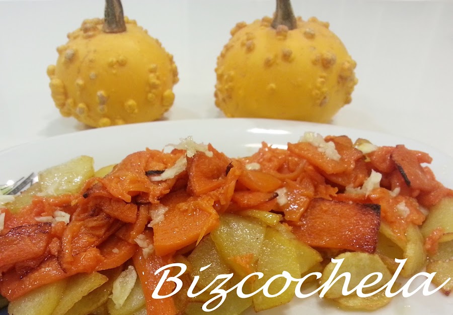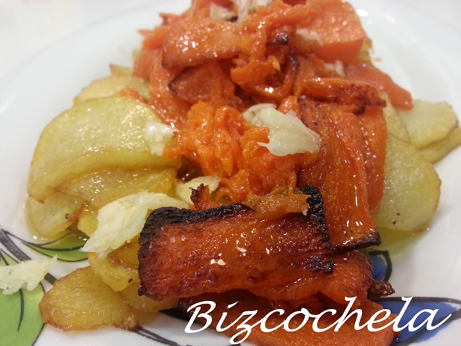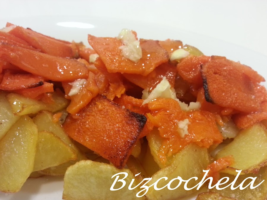 5. - Sacamos la calabaza del horno cuando estén doradas. Y las pondremos sobre las patatas y volvemos a sazonar un poco más.