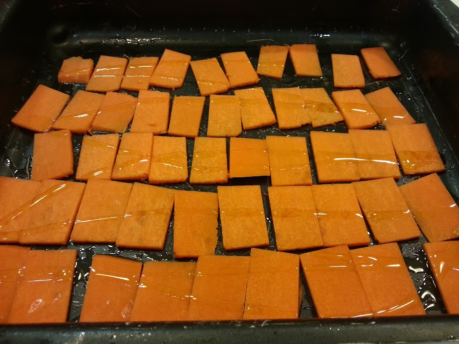 2. - Cortamos la calabaza en rodajas y metemos con un chorro de aceite, más o menos 10 minutos por cada lado, cuando veamos que están tostaditas.