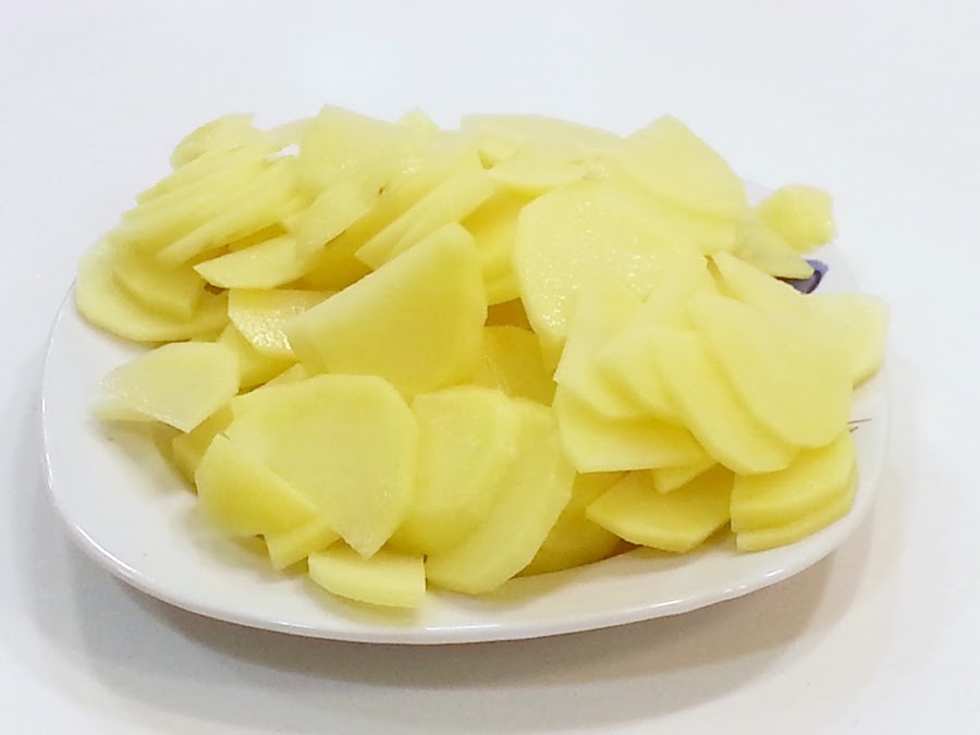 3. - Mientras, pelamos y cortamos las patatas, y las cortamos en rodajas, y las iremos friendo.