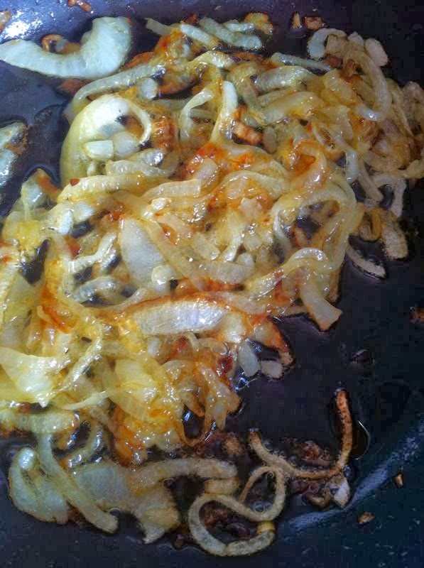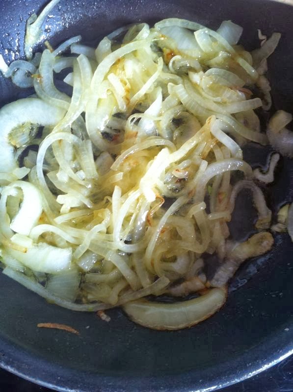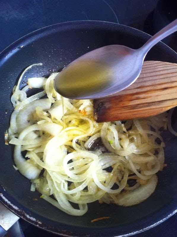 Pocharemos a fuego medio y mientras tanto, abriremos la lata de codornices escabechadas cedidas por elproductogourmet , y cogeremos una cucharada de su aceite para añadir a la cebolla.