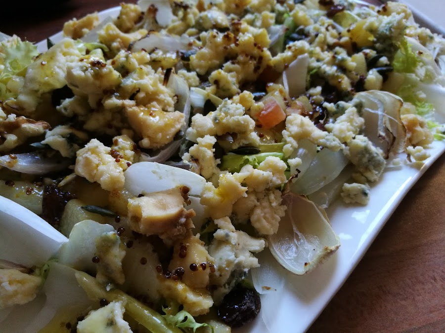 - Repartir las peras, la cebolla, las nueces y el queso desmigado con las manos