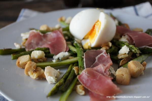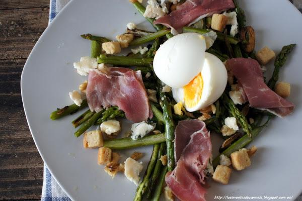 Fuente: Libro " La cocina de Iker " , Iker ErauzkinENSALADA TEMPLADA DE ESPÁRRAGOS, JAMÓN Y ROQUEFORT