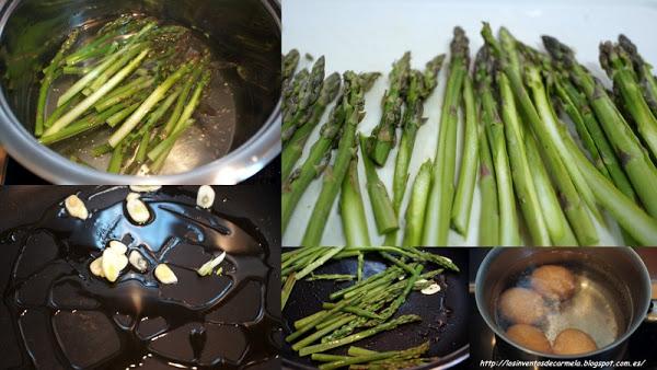 1) Normalmente los manojos que yo compro ya vienen limpios, pero, si no limpiarlos muy bien de tierra. Cortar la parte leñosa de los espárragos y luego por la mitad, a lo largo, cocerlos en agua hirviendo durante unos 3-4 minutos.