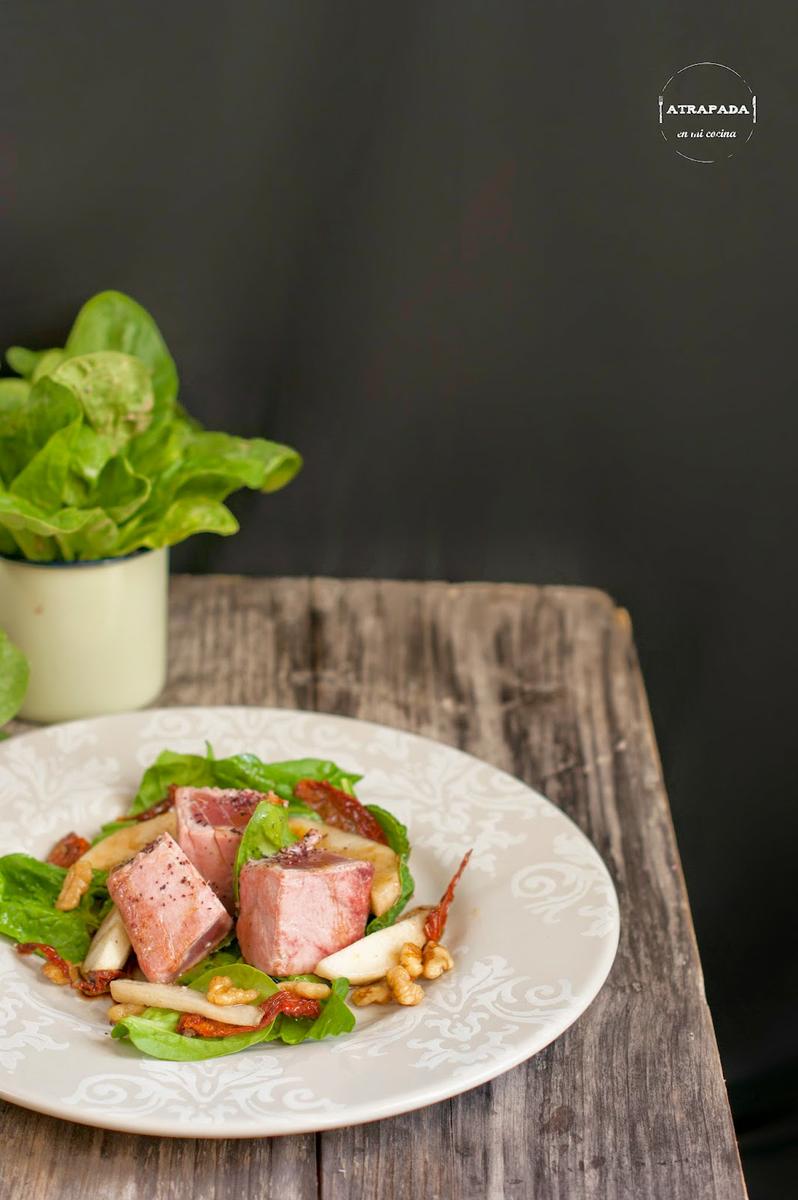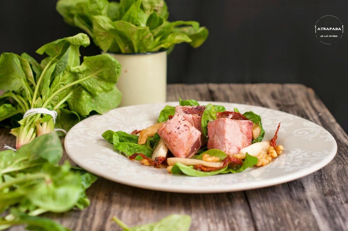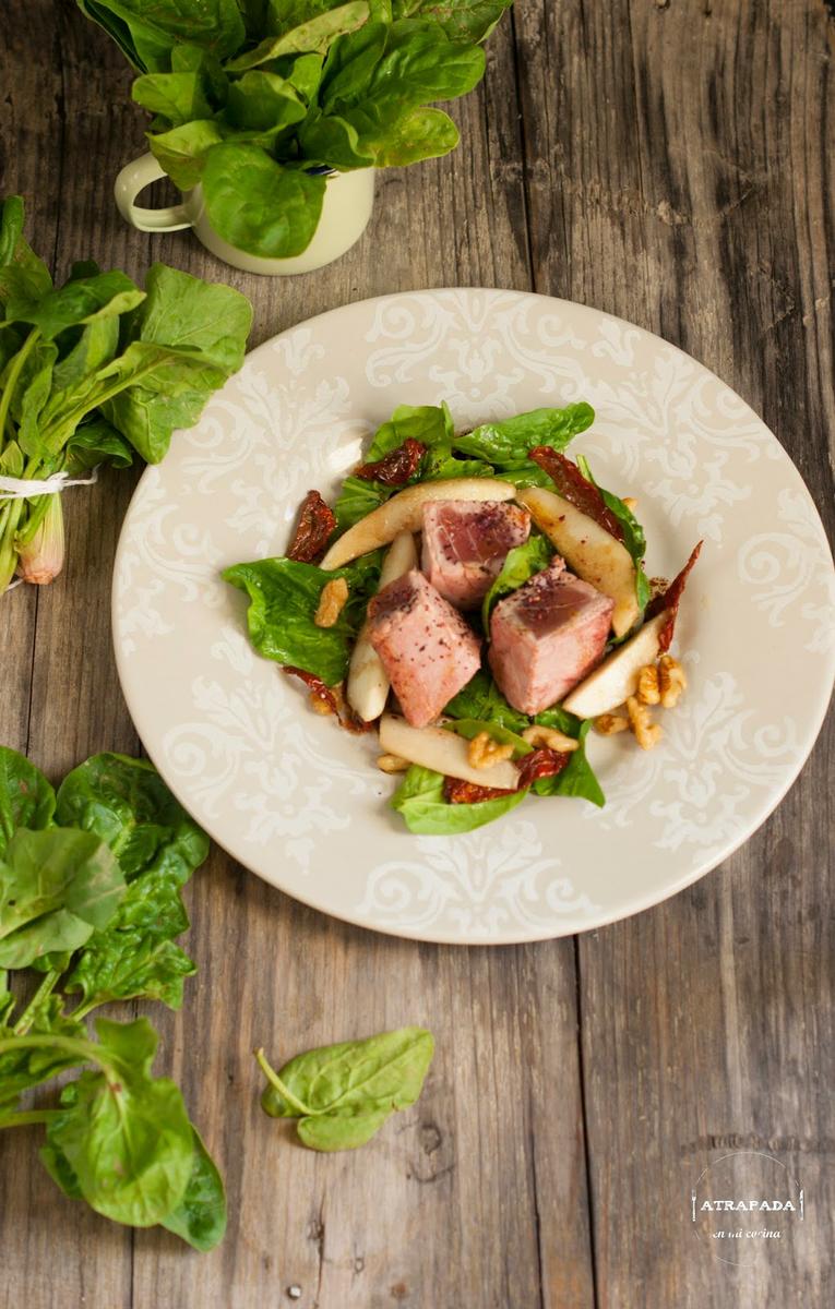 Terminamos la semana con una ensalada, pero no una ensalada cualquiera. Sino una ensalada que se convierte en plato único por la rotundidad de sus ingredientes. En un "tuneo" a una ensalada de Sergi Arola, que llevaba rúcula y solomillo de atún en conserva. Yo he sustituido la rúcula por las espinacas que están de temporada y el solomillo de atún en conserva por atún fresco cocinado a la plancha. El conjunto se completa con nueces, pera y tomates secos en aceite. ¿No os parece una combinación perfecta?.