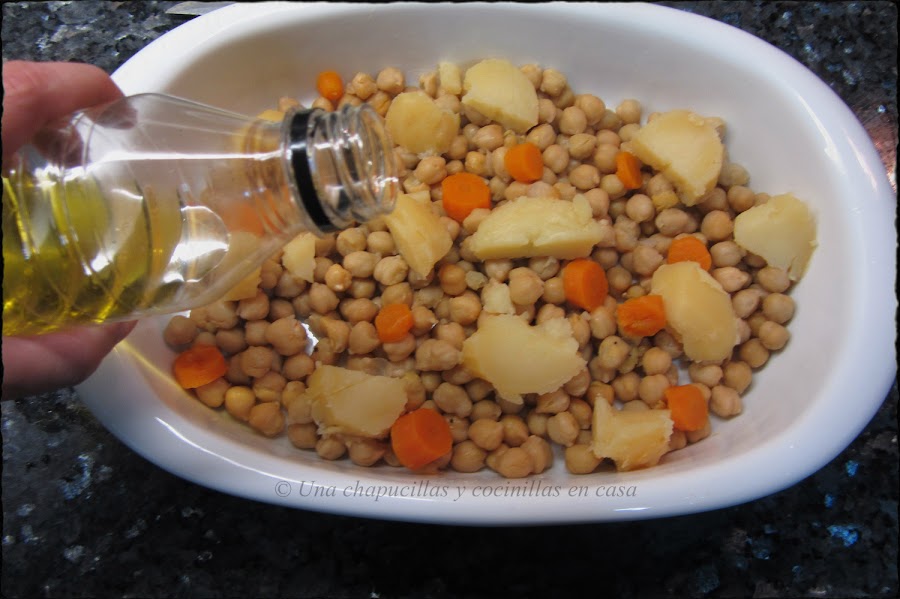 Poner los garbanzos en una fuente, echarles sal, una patata y media zanahoria troceados y un chorrito de aceite de oliva virgen extra por encima.