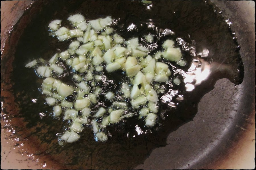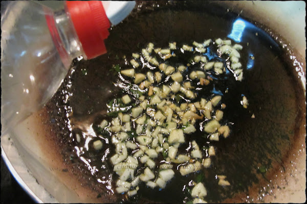 Preparar con dos dientes de ajo troceaditos un sofrito, cuando estén dorados añadir el chorro de vinagre y apartar del fuego para añadir la cucharadita de pimentón. Remover.