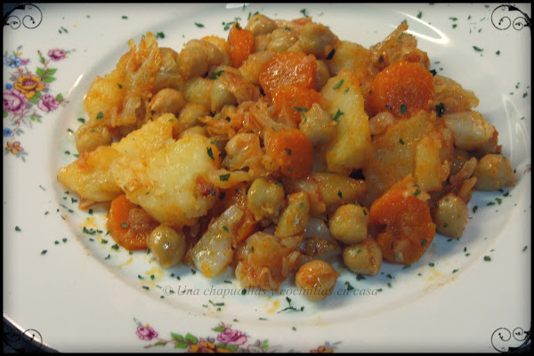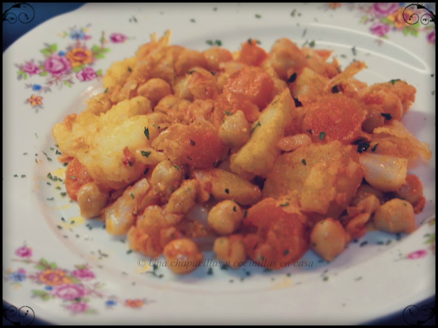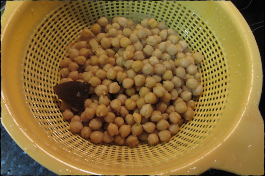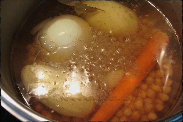 Poner a remojo los garbanzos 12 horas mínimo, escurrir y echar en la olla a presión, junto con dos patatas medianas, 1 zanahoria, el diente de ajo, la hoja de laurel, una pizquita de comino molido, pimienta y una pizca grande de pimentón dulce.
