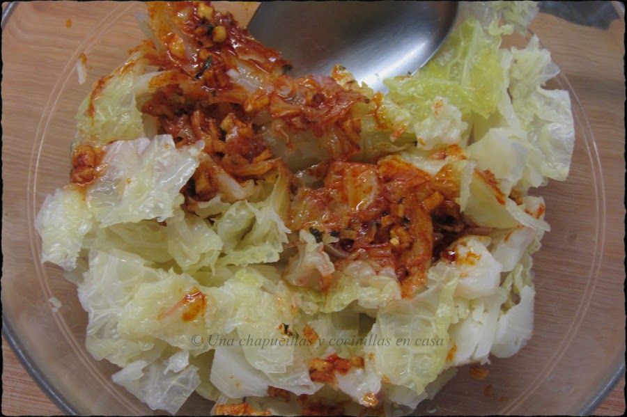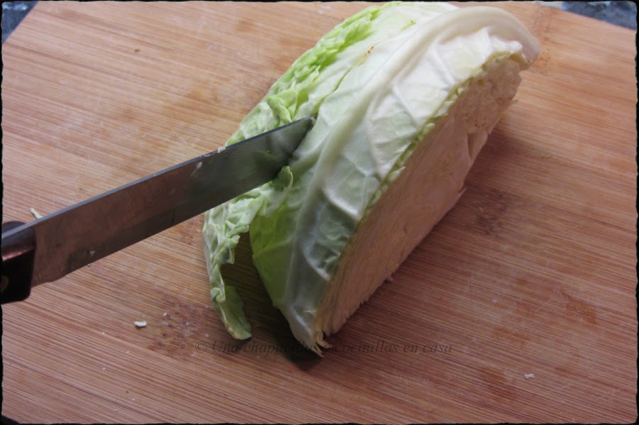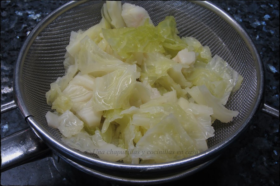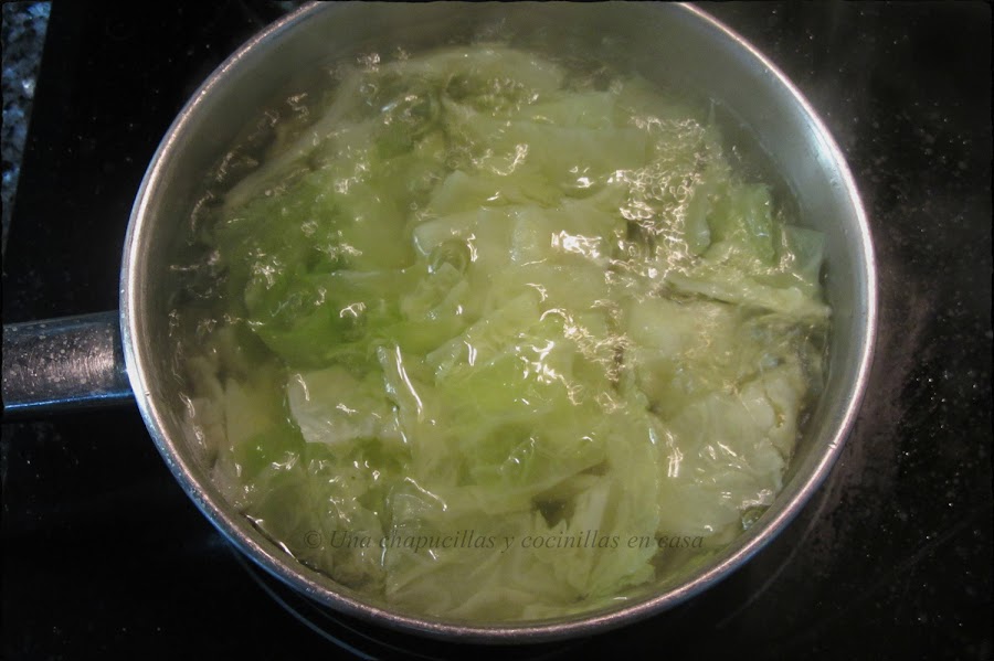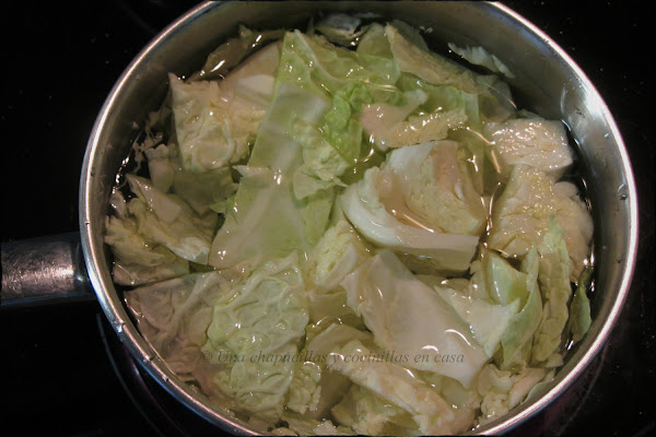 De mientras cortar el repollo o berza en trozos y cocerlo durante 30 min o hasta que este blando.