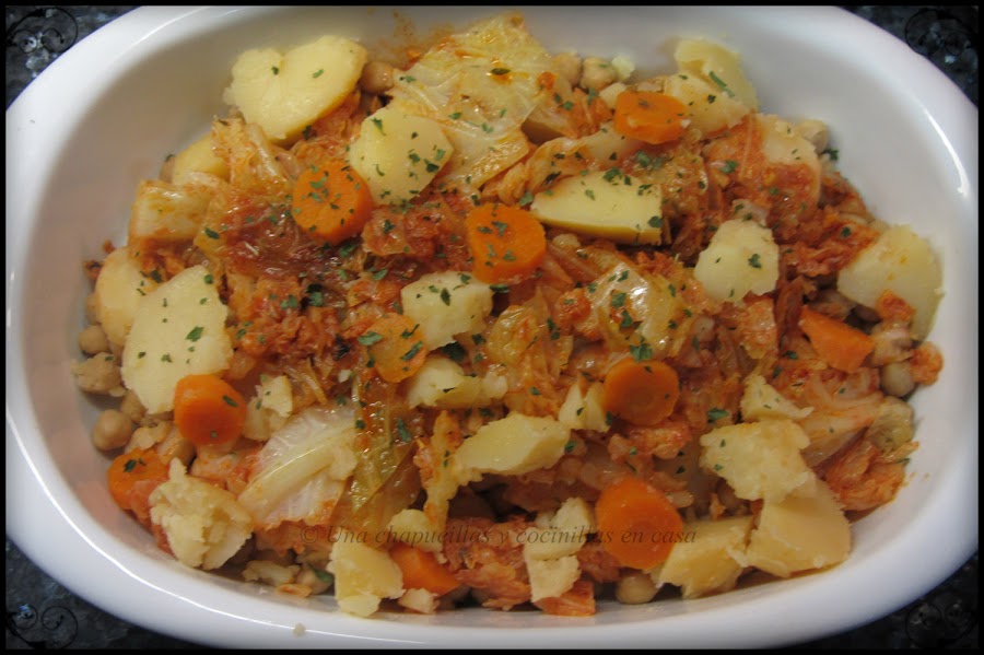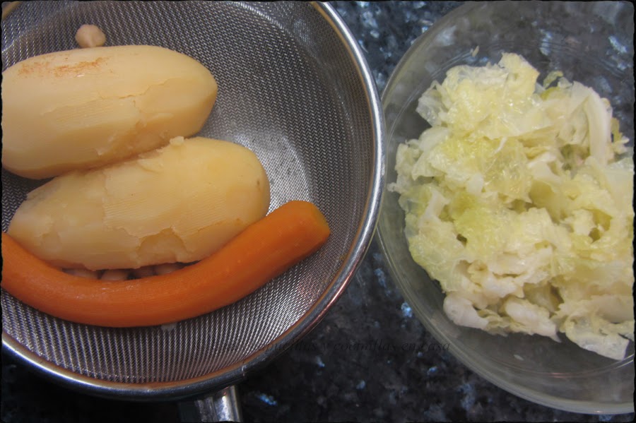 Escurrir la berza y reservar. Escurrir también los garbanzos dejando a parte las patatas y la zanahoria, deshacernos de la cebolla.