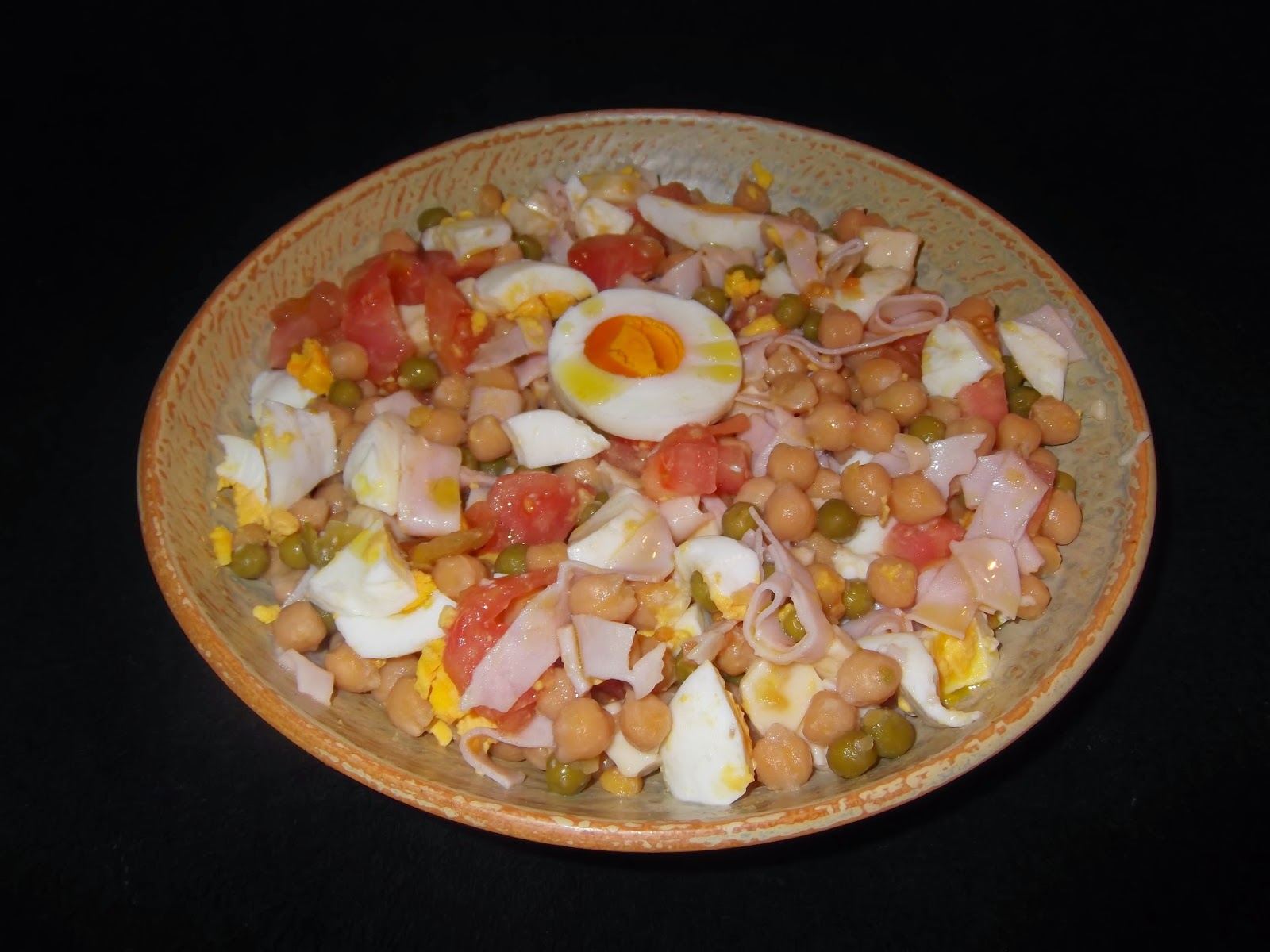 Podéis utilizar un bote de garbanzos ya cocidos, ponerlos a cocer vosotros mismos o usar los del cocido. Si decidís utilizar los de bote darles un agua para que se les vaya el sabor, si usáis los del cocido no tenéis que hacer nada, mientras que si queréis cocerlos vosotros mismos, no olvidéis que la noche anterior los tenéis que poner en remojo cubiertos de agua en un lugar fresco. Al día siguiente pones una cacerola con abundante agua y un poco de sal y cuando empiece a cocer le añades los garbanzos y bajas el fuego. Si es una olla normal suelen tardar unas dos horas, aunque para eso lo mejor es probarlos y ver cuando están listos; para la ensalada lo mejor es que queden un poco duros. Una vez estén en su punto, hay quitarles el agua y pasarlos por debajo del grifo.