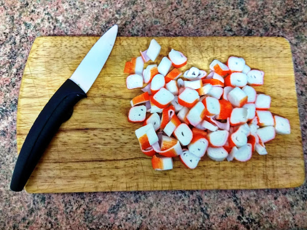 Escurrimos todo bien y troceamos el tomate. También trocearemos la Krissia o Palitos de Cangrejo en rodajas finas. Todo lo vamos poniendo en la ensaladera troceado.