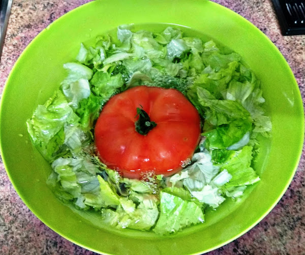 Troceamos varias hojas de lechuga y lo ponemos todo a remojo junto con el tomate, durante unos minutos.