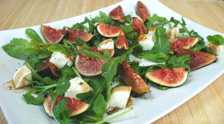 Trocea la mozzarella y distribuye alrededor de los higos. Reparte la rúcula sobre la ensalada.