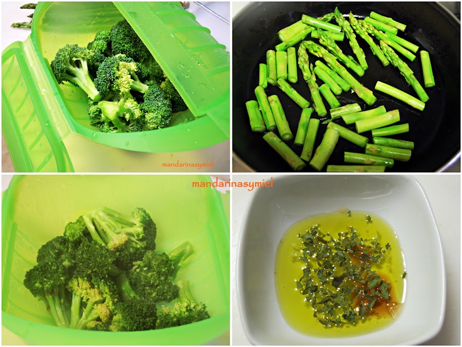 El brócoli lo he cocido al vapor en una vaporera de silicona que va al microondas y en 10 minutos está cocido al dente, pero puedes prepararlo como prefieras o con lo que tu tengas, al vapor o hervido. Lo hagas como lo hagas no lo cuezas demasiado, que se quede algo durito, al dente, para que no se deshaga.