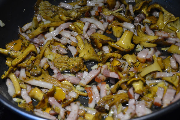 En una sartén ponemos unas gotas de aceite,salteamos las setas (los rebozuelos).