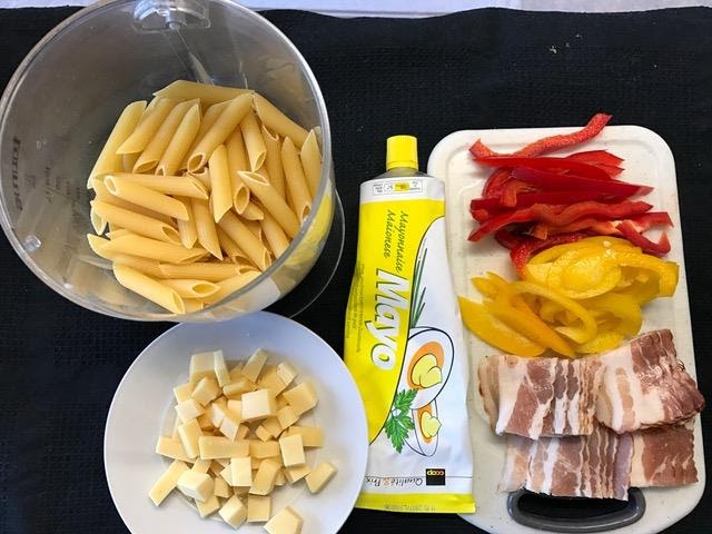En una olla suficientemente amplia para la pasta, poner agua a hervir. Cuando rompa a hervir, añadiremos la sal y coceremos la pasta por el tiempo necesario, preferiblemente al dente. Simultáneamente, en una sartén o wok, con un poco de aceite, rehogaremos el bacon o lo que hayamos elegido. Cuando esté dorado, incorporaremos las tiras de pimiento y lo saltearemos, buscando que quede solo atontado, con lo que con un para de minutos será más que suficiente.