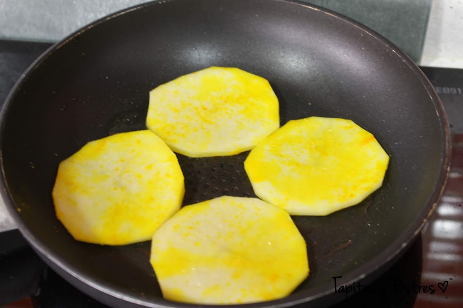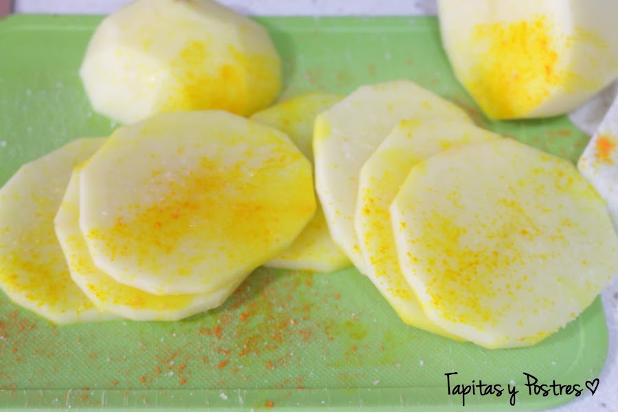 Pelamos la patata, la lavamos y cortamos en rodajas de medio centímetro aproximadamente. La salpimentamos por las dos caras y le espolvoreamos azafrán ligeramente.
