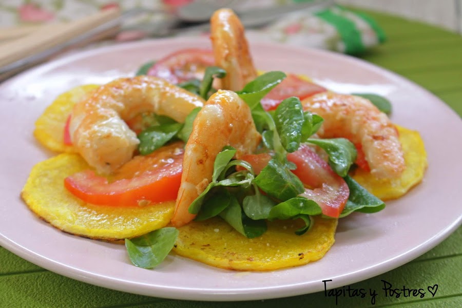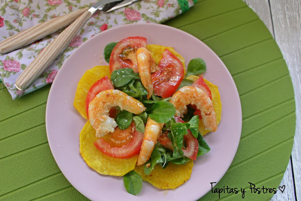 Y al acabar montamos la ensalada con los canónigos (también le va bien los berros o la rúcula), el tomate, las patatas y los langostinos. Aliñamos.