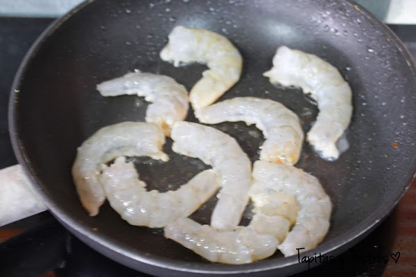 En la misma sartén donde hemos dorado las patatas vamos a cocinar los langostinos unos dos minutos por cada cara.