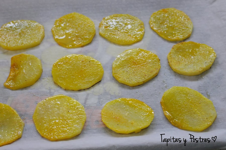 En una sartén ponemos aceite de oliva (yo uso un spray así reduzco las calorías). Cuando esté caliente doramos las patatas por las dos caras. Las reservamos en una bandeja de horno con papel vegetal y las asamos unos diez minutos a 180º, para que se terminen de hacer.