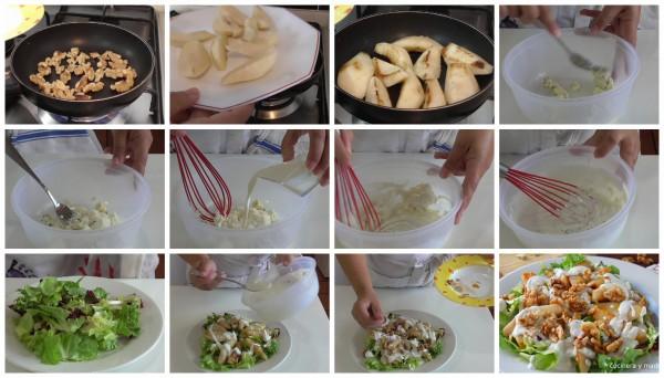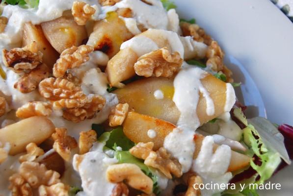 Bueno le añadimos una buena cantidad de la salsa de queso; que es la gracia de esta ensalada, y por último las nueces; y ya tenemos lista nuestra ensalada templada de peras y queso.
