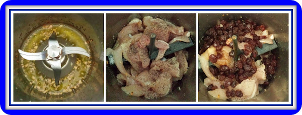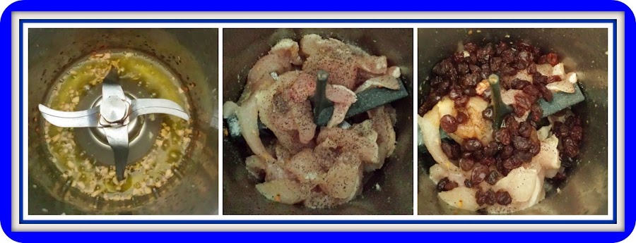 Ponemos la mariposa y añadimos el pollo cortado en tiras junto con la sal y pimienta al gusto, el caramelo liquido, las pasas y el vinagre de manzana, sofreímos 7 minutos, temperatura Varoma giro a la izquierda, a velocidad 1, sin poner el cubilete para favorecer la evaporación.