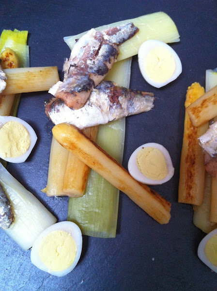 Primero poniendo los puerros en la base y seguido los espárragos.
