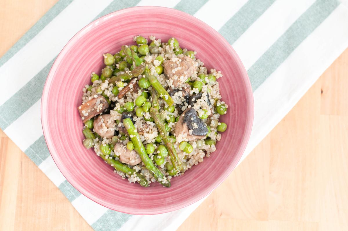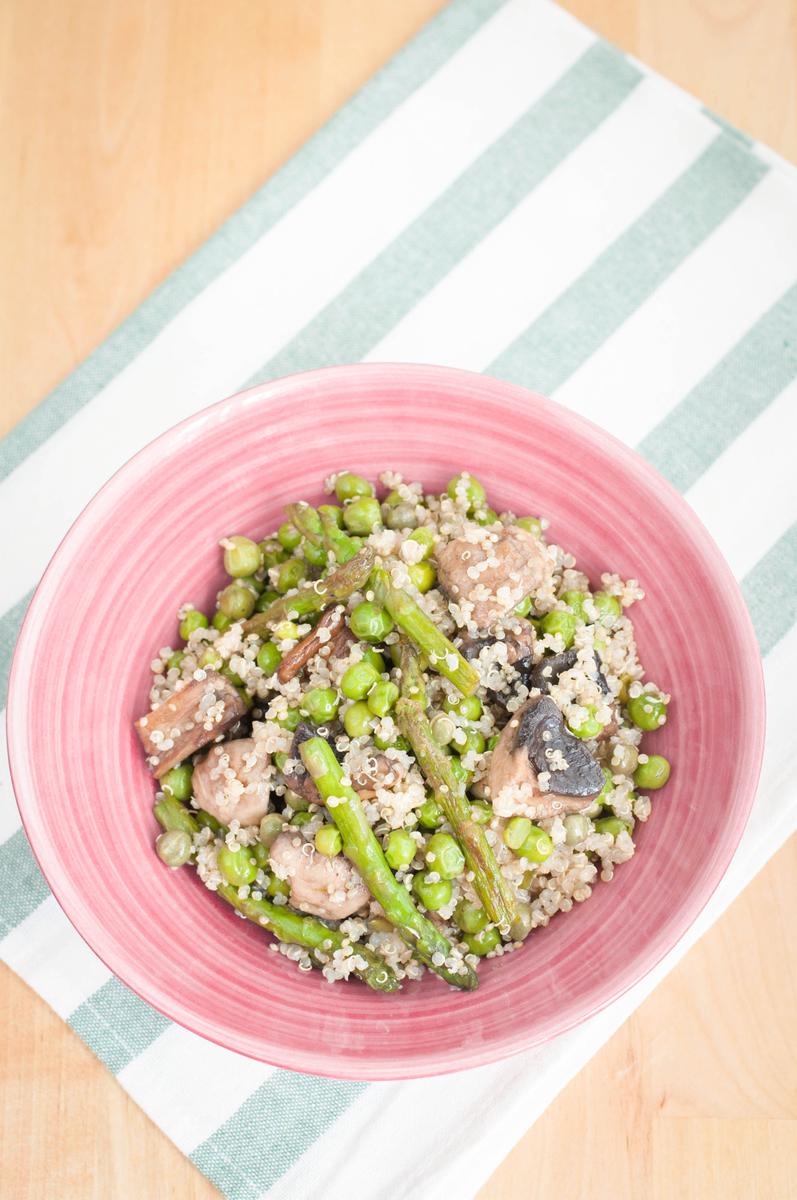 La calidad del producto es importante a la hora de cocinar cualquier plato, pero esa importancia se vuelve fundamental cuando hablamos de verduras crudas o cocinadas al dente. En esta ensalada las verduras están cocinadas lo justo, manteniendo ese punto crujiente que me encanta para este tipo de platos. Los guisantes frescos la quinua, los espárragos y los champiñones son de primera para conseguir un resultado de lujo.