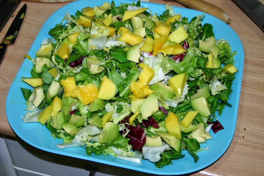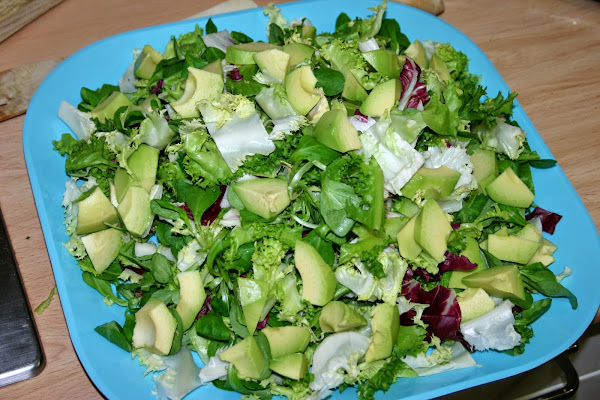 lo primero es poner en una fuente grande las lechugas y sobre ella partimos el aguacate en trozos