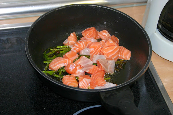 una vez que esten bien fritos los trigueros echamos el salmon y otra pizca de sal, lo freimos