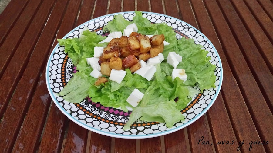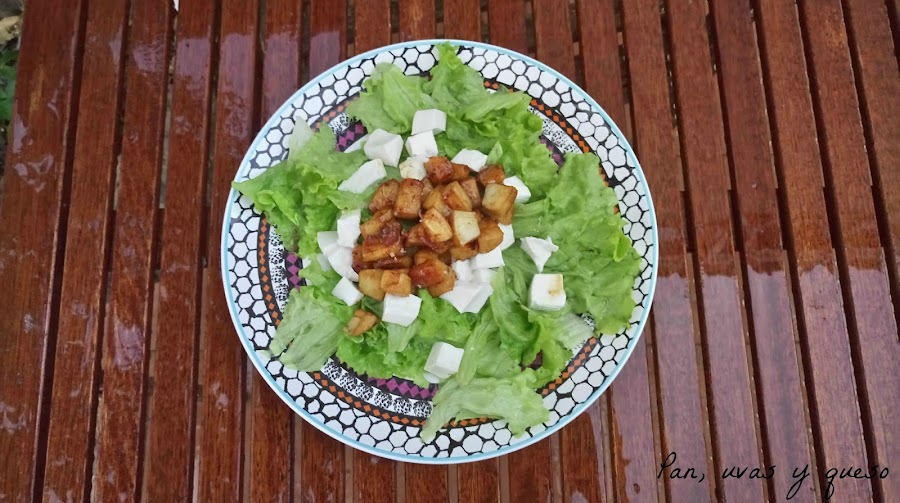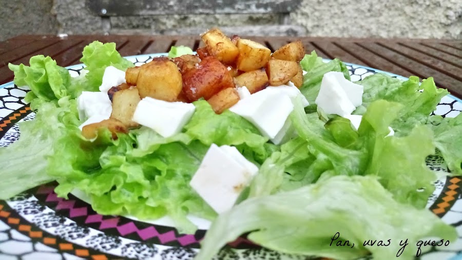 Lavamos la lechuga y la escurrimos. La colocamos en una ensaladera y la aliñamos a nuestro gusto. Troceamos el queso de cabray lo ponemos sobre la lechuga.