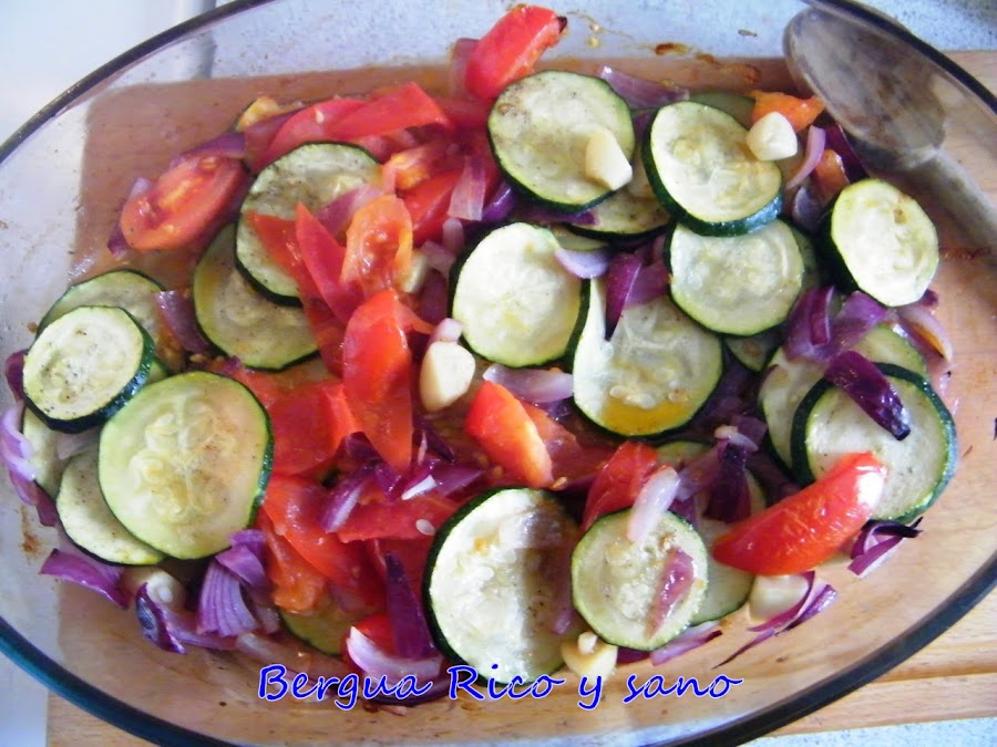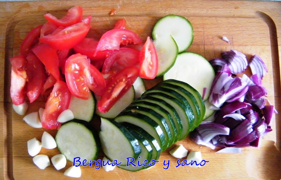 1. Primero nos preparamos las verduras. Las lavamos y vamos cortando el calabacín en rodajas, el tomate en gajos (o en mitades si son cherry), la cebolla en gajos también y los dientes de ajo pelados y por la mitad.