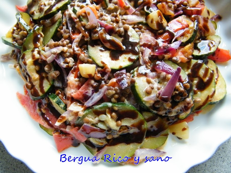 Sinceramente, las ensaladas podrán ser sanas y ligeras, incluso ricas e interesantes a veces, pero yo rara vez me como una ensalada y pienso: "Esto está de vicio". Pues señoras y señores, ha llegado el día, y como se lo ha merecido, se le ha quedado el nombre "de vicio". Me he puesto a mezclar y he acabado con una ensalada templada de verduras ligeramente asadas, ricotta, lentejas y una vinagreta deliciosa de mostaza de miel y vinagre balsámico, y mira que a mí ni la mostaza ni el vinagre me gustan, pero es que todo en esta vida es saber combinar ;) Y no sólo está requetebuena, sino que encima tenemos una forma más de comer legumbres, con la falta que nos hacen, y tenemos el plato listo en menos de 30 minutos. Vamos, que lo de hoy ha sido un éxito rotundo; aquí te lo dejo: